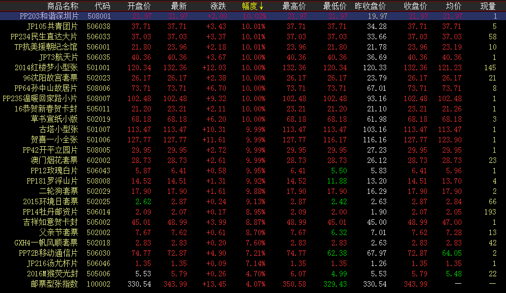 涨幅榜方面,玫瑰白片继续上行,开盘上攻,局部震荡成交后保持高位运行,以涨停价报收。抗美援朝涨势持续,开盘后持续小幅攀升,拉涨封停。红楼梦小型张在放量买入的同时,发力拉涨上攻,涨停收尾。沈阳故宫开盘拉升,一字涨停。牡丹邮资片、罗浮山片等震荡走红,涨幅较大。成交活跃度方面,红楼梦小型张放量买入,价量齐升。终审法院、唐诗三百首午盘成交活跃,买卖两旺。蛇行大运以稳健涨势助力交投。三轮虎、三轮羊小幅震荡前行,尾盘放量成交。木兰辞套票、海事博物馆等以微涨稳健走势,成交量可观。今日环球盘面,整体上继续保持良好上升走势。具体而言,各个藏品积极发力前行,在涨幅调整及多方跟投期,热点及投资价值逐步凸显。此时选好投资品种积极跟进,及时稳步跟投,顺势而上应为不错选择。后续走势继续关注。