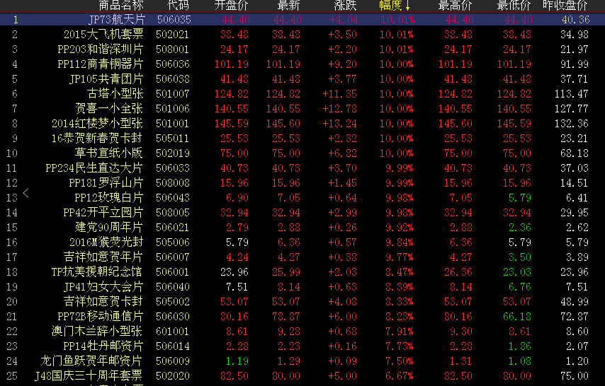 今日环球综合指数上涨40.58点,涨幅0.52%,收报7915.55点。分类指数,邮资封片、邮票型张、TOP20继续领涨,港澳邮票、电话磁卡下跌,缩量普片、金银纸币微涨。涨幅榜方面,红楼梦小型张开盘拉涨,放量买入价量齐升,涨停收尾。玫瑰白片涨势继续,再创新高,开盘后震荡上行,买方主导继续做多,增量交易拉涨封停。抗美援朝继续上攻,早盘稳步攀升,午盘震荡调整红盘报收。建党90周年开盘收红,尾盘买方发力拉涨收红。开平立圆片、古塔小型张等开盘拉升,连日来保持上涨升势。成交活跃度方面,红楼梦小型张午盘放量买入,继续拉涨助力红盘。木兰辞小型张、抗战小型张开盘微涨放量买入,买卖交投博弈期间一度走高。终审法院、唐诗三百首、三国五小型张、三轮羊、三轮虎等买卖双方各自继续发力,午盘增量成交。红楼梦小版小幅震荡上行,午盘持续放量交投,稳健上行成交可观。今日环球盘面,整体走红、多方上涨之势继续,各个品种盈利效应不同形式显现,持续跟踪关注,操作价值与机会尽在其中。