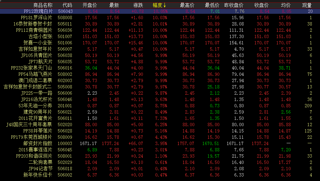 今日环球综合指数下跌17.02点,跌幅0.21%,收报7959.35点。分类指数,邮资封片继续领涨,邮票型张、港澳邮票小幅下调,其他版块稳健运行,涨跌变动不大。涨幅榜方面,玫瑰白片继续上升,高开高走,买盘拉涨封停。恭贺新春贺卡封、吉祥如意贺年片、古塔小型张等卖方主导开盘拉升,一字涨停。马踏飞燕片、一带一路买方发力放量买入,超跌反弹。红楼梦小型张、抗美援朝连涨多日后,卖方部分抛出,价位回调。成交活跃度方面,终审法院、唐诗三百首、红楼梦小版、三国五小型张、蛇行大运等午盘交投活跃,期间大单量交投助力成交。武陵源风光走势稳健,开盘后持续交投,午盘大单量成交。木兰辞小型张、抗战小型张等交投活跃度不减,继续保持稳健成交。今日环球盘面,分类版块指数涨跌调整,邮资封片继续领涨,邮票型张、港澳邮票受权重品回调影响指数下调。当前盘面指数、个品价位大体上仍处于低位,虽连日上涨后整体涨幅下调,但趋势依旧向上,大方向还是以涨为主,并且涨跌分化变动也是机会显现的最佳时机。