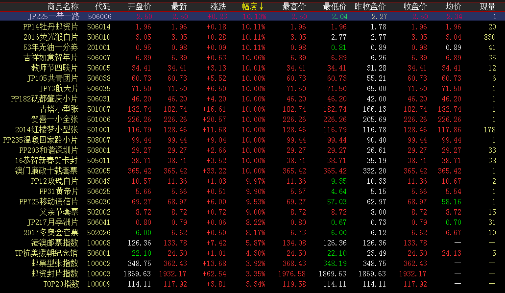 今日环球综合指数上涨69.17点,涨幅0.87%,收报8048.92点。分类指数,除邮资封片继续上涨外,邮票型张、TOP20、港澳邮票再度走红,其他版块如缩量普片、金银纸币、电话磁卡依旧稳健运行。涨幅榜方面,红楼梦小型张买盘发力,拉涨封停,经短期回调、平稳蓄势后再度上行,助力版块指数走红。玫瑰白片继续上行,买盘拉升,震荡运行,涨停报收。吉祥如意贺年片、恭贺新春贺卡封、牡丹邮资片等卖方主导开盘拉升,一字涨停。一带一路开盘小幅震荡上行,放量买入,涨跌变动中稳步上行。成交活跃度方面,终审法院午盘买卖持续交投,价格微涨交投活跃。红楼梦小型张午盘放量买入,以成交量助力涨势。唐诗三百首、红楼梦小版开盘微涨收红,成交量亦稳扎稳打,稳健前行。木兰辞小型张、抗战小型张价格走势平稳,交投稳定活跃,低价大单量助力成交。今日环球盘面,邮资封片继续收红,港澳邮票受权重品走势带动超跌回升,邮票型张在涨幅品种发力助攻下再度走红。版块整体走势与热门藏品亮点互动,观走势抓亮点,价值与机会潜伏其中,期待后市深度挖掘。