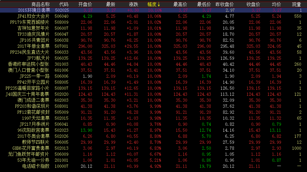 涨幅榜方面,天坛套票买方继续发力,增量成交,涨停报收。菊花邮资封涨势继续,终审法院开盘上攻,各自买盘拉涨一字涨停。人口普查、年册等买方持续跟进,开盘拉升高位涨停。吉祥如意贺年片、国庆三十周年等开盘后卖方拉涨,涨停收尾。成交活跃度方面,唐诗、红楼梦小型张、三国五、香港猴、红楼梦小版等买卖交投活跃,走势稳健持续,领跑盘面交投。澳门海事、夜宴图、木兰辞套票、三轮虎等红线上方小幅波动、持续交投,助力成交。近期环球盘面,红盘品种数量增多、涨幅加大,各自积极发力争相较劲;新亮点也逐步显现,后市新一轮涨势品种潮逐渐汇聚,推动盘面稳步向纵深发展。操盘方面,稳健持有以待后市,抑或适时调整大胆跟进,相信都会有适合自己的不错选择。