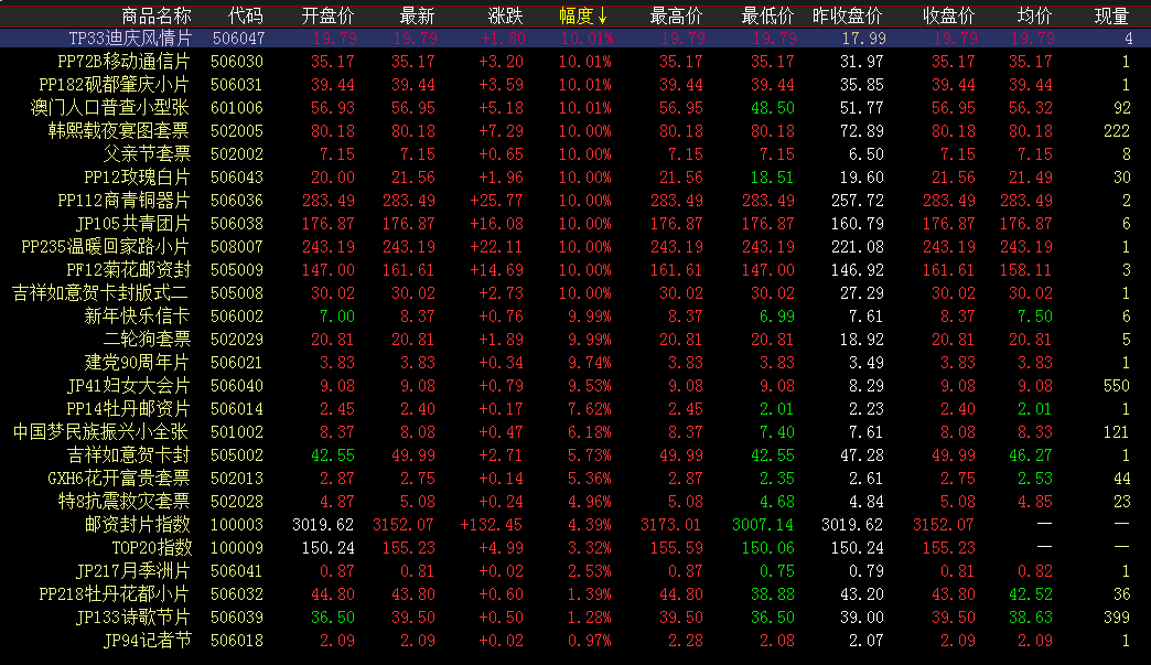 今日环球综合指数上涨38.86点,涨幅0.46%,收报8472.81点。分类指数,邮资封片、TOP20、缩量普片、电话磁卡不同幅度上涨,邮票型张、港澳邮票、金银纸币小幅下调。涨幅榜方面,中国梦民族振兴小型张,开盘上攻至涨停价位,高开高走,午盘震荡涨幅下调,成交量继续扩大。夜宴图高开高走一字涨停,午盘增量成交,价量齐升涨势正猛。人口普查早盘短期震荡,之后重新走高,买方持续跟进,涨停收尾。玫瑰白片、菊花邮资封买盘继续发力,开盘小幅震荡,其后高位运行,涨停封板。妇女大会、牡丹邮资片等卖盘助推拉涨,处于上升区间。成交活跃度方面,终审法院、红楼梦小型张、荧光猴白片等继续稳健上行,买卖交投活跃,领跑盘面成交。唐诗、三国五、香港猴、红楼梦小版等小幅持续成交,成交量及活跃度居前。三轮羊、三轮虎、澳门海事、木兰辞套票等等开盘后红线上方买卖持续小幅成交,助力交投。今日环球盘面,版块涨多跌少,综合指数在昨日回调后重新上升。市场纵深发展及新行情推动期间,走势逐步推进波浪式上行,新力量梯次加入,摩拳擦掌之势已有感受。继续积极跟进,坚定前行!