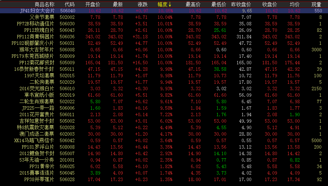 涨幅榜方面,玫瑰白片继续发力上攻,早盘震荡走高,午盘持续高位运行,涨停封板。菊花邮资封开盘后逐级攀升,涨停报收,经短期蓄势,买盘继续发力上行。妇女大会、商青铜器片、砚都肇庆开盘上攻,卖方拉涨一字涨停。天坛套票买方放量买入,再度拉涨收红。成交活跃度方面,荧光猴白片开盘不久即放量买入,大单量交投,午盘持续,稳居成交榜前列。红楼梦小型张持续稳健前行,午盘放量成交。唐诗、香港猴、三国五、红楼梦小版等小幅持续交投,成交量稳定可观。三轮羊、三轮虎红线上方小幅波动,买卖交投活跃。人生旅途崎岖漫长,走好脚下的每一步,不妥协,不放弃。向着目标奔跑,何必在意折翼的翅膀,只要信心不死,就看得见方向。顺风适合行走,逆风适合飞翔,努力迎风奔跑,快乐即存在于抗争困难的过程中。加油!