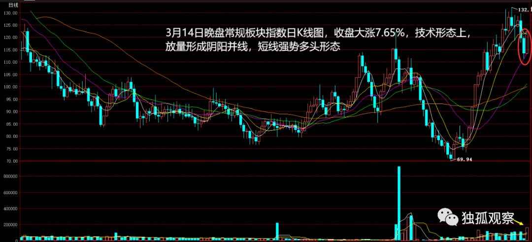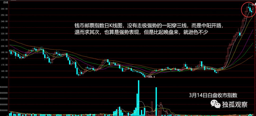 我们再来看看周六的晚盘。继续和白盘交相辉映,但白盘与晚盘相比,明显暗淡不少。其实,昨天白盘明显可以走的更强一点儿,玩一个一阳穿三线,效果会更好。不过,这里再蓄下势,拉个中阳线探探路,下周再借势突破,也是不错的选择。