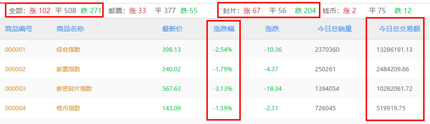 大盘:小幅下跌,延续弱势,四连跌,超预期,从分时看,尾盘获得一定支撑,小幅回升。整体涨少跌多,成交额1329万元,与昨天基本持平,并未出现明显减少,估计有一定资金在低吸。国内外资本市场持续动荡,邮市投资者在情绪上受到一定影响。有投资者把近期市场的下跌与邮币直播联系在一起,这是明显的唯心主义,直播中并没有什么利空内容,市场的走势有其客观性是多因素共同作用的结果,主要是供求关系的体现,行业大环境所决定。投资市场的基本定律七亏二平一赢,最终盈利的终是少数,所以我们一直提倡,闲钱投资,耐心为上,其次磨砺人性,提高投资能力。