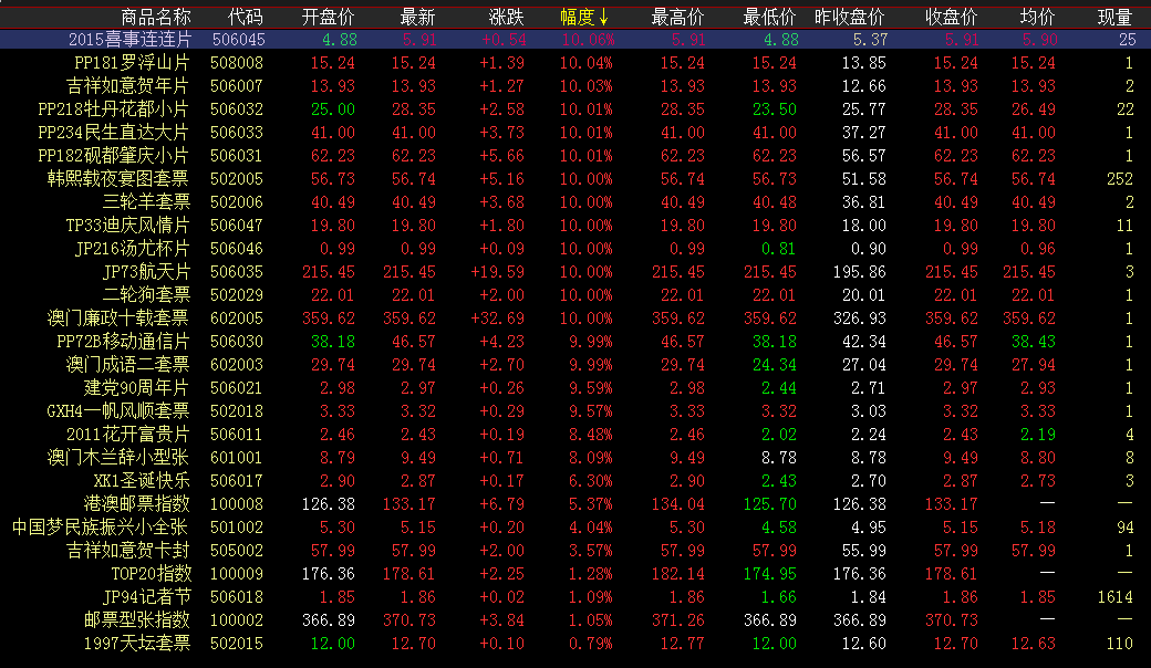 涨幅榜方面,夜宴图、三轮羊继续发力买盘拉涨,开盘上攻至涨停价位,高开高走涨停封板。喜事连连片低开蓄势,午盘快速拉升,涨停价位持续成交。牡丹花都小片,开盘小幅回落,随着买入持续跟进,价位逐渐回升,尾盘发力上攻, 涨停报收。罗浮山片、民生直达、砚都肇庆延续上行走势,开盘走高,一字涨停。 成交活跃度方面,红楼梦小型张早盘微涨上行,买卖持续交投,大单量成交并行。抗战小型张、木兰辞小型张大单量交投,成交量有所放大。唐诗、三国五、香港猴、蛇行大运、红楼梦小版等继续稳健前行,小幅持续成交,活跃盘面交投。上坡的路难走,走上去会很累,但你要是不走,就看不到山顶上的风景。不要忘了当初,你曾经为了梦想而有过的勇气,把那一刻的勇气,化为此时的坚持,你终将遇见更好的自己。加油!