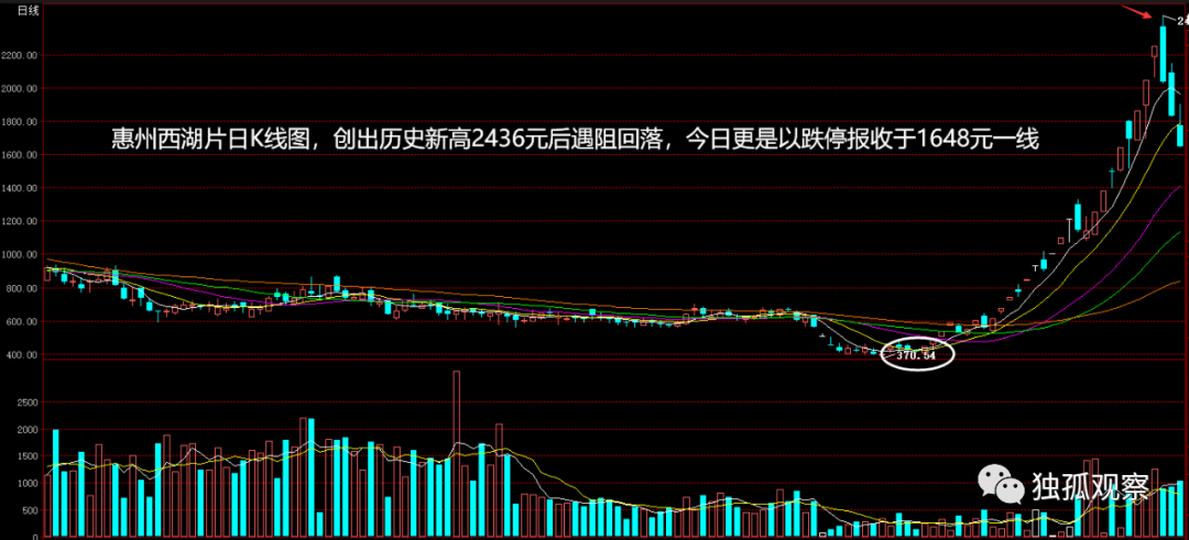 截止今天收盘,惠州西湖片跌停报收于1648.63元,具体的走势是这个样子滴,而我们的投资人基本上卖在了一个次高点,全身而退。