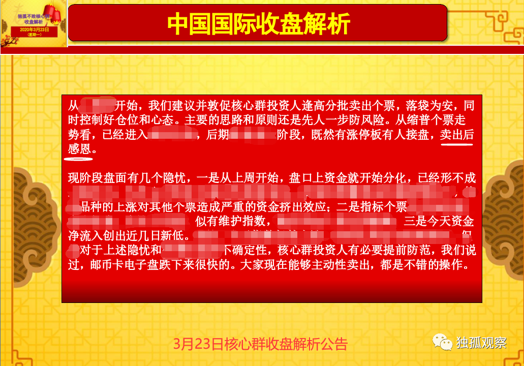 核心群投资人关于惠州西湖片的成本基本上在550元一线,有投资人在该片涨到2000元以上时,特别纠结,询问我们如何处理?他手里面有20片。之前,独孤大师在核心群讲过,能够主动卖出的操作都是好的操作。我们在核心群已经做出了相关提示。