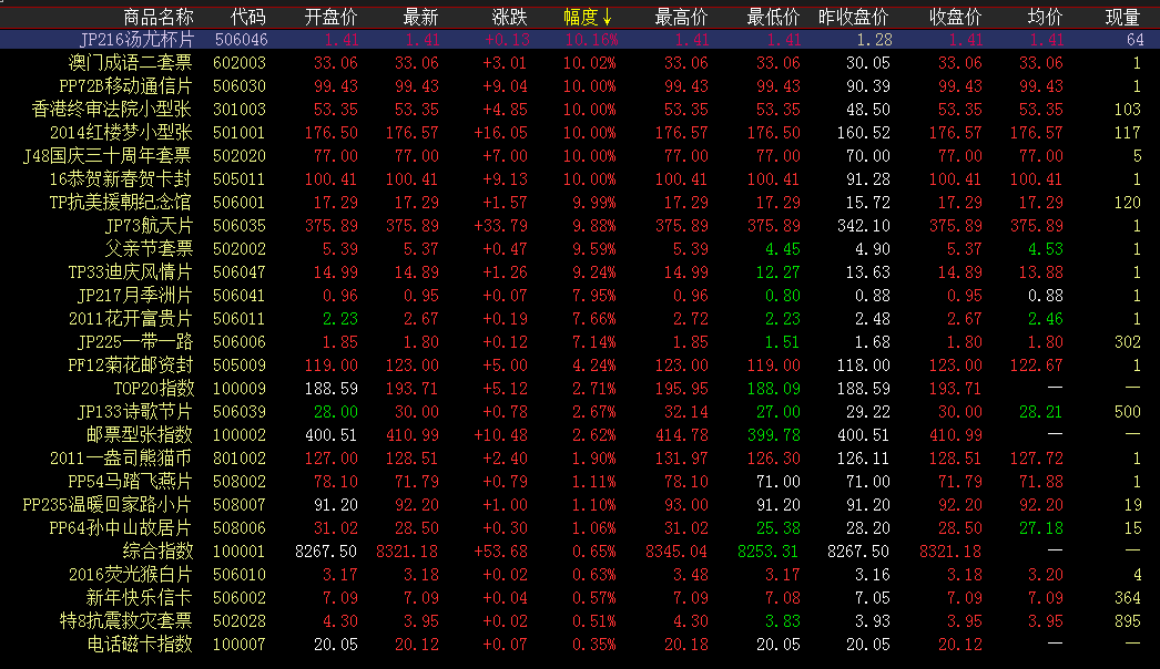 涨幅榜方面,终审法院、红楼梦小型张买方持续拉涨,高开高走,继续上行。澳门成语二套票,卖盘发力拉升,早盘上攻走高,涨停报收。国庆三十周年早盘上攻,买方拉涨小幅成交,逆势上行。恭贺新春贺卡封继续攀升,开盘走高卖盘拉涨封停。菊花邮资封开盘微涨,随后上攻至涨停价位,买卖交投小幅成交,午盘回落,尾盘再度上攻,涨停报收。成交活跃度方面,终审法院、红楼梦小型张继续高开高走,买方持续投入,成交量持续稳定。抗战小型张、木兰辞小型张买卖交投活跃,大单量成交助力盘面交投。唐诗、三轮羊、香港猴、红楼梦小版等继续稳健前行,午盘小幅持续成交,活跃盘面交投。每个优秀的人,都有一段沉默的时光。那段时光,是付出了很多努力,忍受孤独和寂寞,不抱怨不诉苦,日后谈起时,连自己都能被感动的日子。唯累过,方得闲;唯苦过,方知甜。周末愉快!