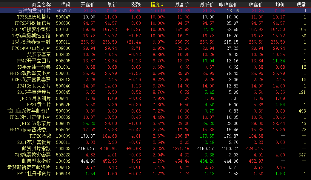 涨幅榜方面,权重藏品红楼梦小型张超跌反弹,早盘走高买方拉涨,午盘高位成交涨停报收,带动板块收红。吉祥如意贺年片、恭贺新春贺卡封继续高开高走大涨收红,卖盘拉涨再破新高。抗美援朝纪念馆、迪庆风情片、孙中山故居片探底回升,买卖方各自发力逆势上行,尾盘收红。成交活跃度方面,三轮羊、蛇行大运、唐诗、三国五、香港猴等微涨收红,午盘持续成交,活跃盘面交投。抗战小型张、木兰辞小型张保持微涨走势,买卖持续交投,大单量成交引领盘面交投。荧光猴白片张低价位大单成交,成交量持续稳定。障碍与挫折,是通往成功最稳靠的踏脚石,肯研究、利用它们,便能从失败中培养出成功。