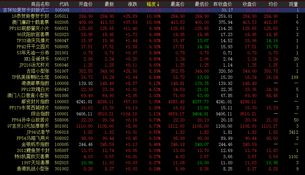 涨幅榜方面,恭贺新春贺卡封、砚都肇庆卖盘拉涨继续上行,开盘上攻小幅成交,大涨收红。澳门廉政十载买方继续发力拉升涨势继续,午盘快速上行小幅持续成交,涨停封板。沈阳故宫卖盘发力涨幅扩大,高开高走大涨收红。迪庆风情片开盘卖方拉涨走高,短暂下探蓄势后再度上行,大涨收红。 成交活跃度方面,抗战小型张、木兰辞小型张继续增量成交,开盘微涨大单量成交,买卖成交两旺。唐诗、三轮羊、三国五、澳门海事、香港猴等午后持续放量成交,活跃盘面交投。立志要如山,行道要如水。不如山,不能坚定;不如水,不能曲达。