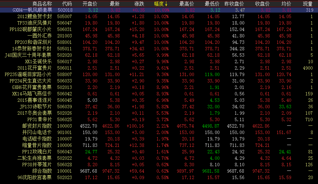 涨幅榜方面,恭贺新春贺卡封、砚都肇庆持续攀升,开盘快速上攻,高位运行涨停封板。迪庆风情片较之前涨幅扩大,高开高走一字涨停,延续上行走势。国庆三十周年套票早盘升高涨停封板,涨跌互现短暂下探后再度回升。和谐深圳片短期涨跌蓄势,阶段性拉升,涨停收红,总体走势持续向上。温暖回家路早盘微涨蓄势,午盘持续成交,尾盘快速上攻大涨收红。 成交活跃度方面,红楼梦小型张、终审法院继续微涨运行,午盘买卖持续交投,成交量扩大。抗战小型张、木兰辞小型张早盘微涨局部震荡,持续放量交投,增量成交继续稳居成交榜前列。三轮羊、唐诗、三国五、夜宴图、蛇行大运等保持稳健运行,买卖盘互动,午后持续交投,助力盘面成交。目标和梦想是成长的核心成分。勤奋学习和努力工作是成长的必由之路。征服的勇气和愉悦的心情是成长的营养剂。