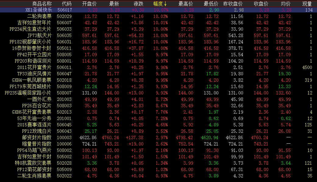 涨幅榜方面,恭贺新春贺卡封、砚都肇庆、和谐深圳片继续攀升,开盘走高高位运行大涨收红。迪庆风情片涨幅持续,早盘上行至高位,午盘下探回调后重新上攻,大涨收红。吉祥如意贺年片短期蓄势后,延续前期涨势继续上行,高开高走涨停报收。二轮狗超跌反弹,早盘快速升高涨停封板。 成交活跃度方面,红楼梦小型张、终审法院小型张早盘短期升高回落继续企稳运行,午盘开启持续放量交投模式,成交量保持前列。抗战小型张、木兰辞小型张早盘微涨收红,期间宽幅震荡,买卖交投活跃,增量成交。唐诗、三轮羊、蛇行大运、三国五等红线上方短期震荡,整体走势平稳,午盘继续活跃交投,助力盘面成交。最富有成就的人就是依靠他们自己的自信、智能和能力取得成功的信念,好比航标灯射出的光芒,在浩瀚的人生海洋中,牵引着人们战胜一切灾难和苦难,一步步走向辉煌。