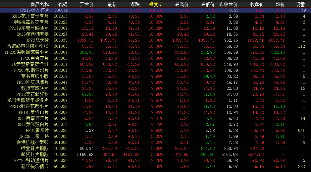涨幅榜方面,终审法院卖盘买盘持续投入,连续发力拉涨,高开高走持续成交涨停封板。温暖回家路涨势延续,早盘低开高走,短暂下探后快速拉升小幅成交涨停收尾。恭贺新春贺卡封短暂下调后重拾升势,开盘走高一字涨停,再续新高。迪庆风情片延续上行走势,高开高走大涨收红。菊花邮资封跌后回升,早盘低开蓄势逐级攀升至高位,买卖交投小幅成交,尾盘再度拉升大涨收红。百合花片蓄势上行,承接前期升势涨幅扩大,开盘上攻卖盘拉升至高位涨停收尾。成交活跃度方面,终审法院买方持续放量投入,价量齐升继续领跑成交榜。红楼梦小型张买卖交投活跃,红线上方宽幅震荡微涨收红,午盘放量成交活跃盘面交投。三轮羊、唐诗微涨收红买卖两旺,午盘持续交投,成交量扩大。木兰辞小型张、抗战小型张早盘小幅度成交,午盘持续跟进,增量成交助力盘面交投。我们的生命,就是以不断出发的姿势得到重生。为某些只有自己才能感知的来自内心的召唤,走在路上无法停息。