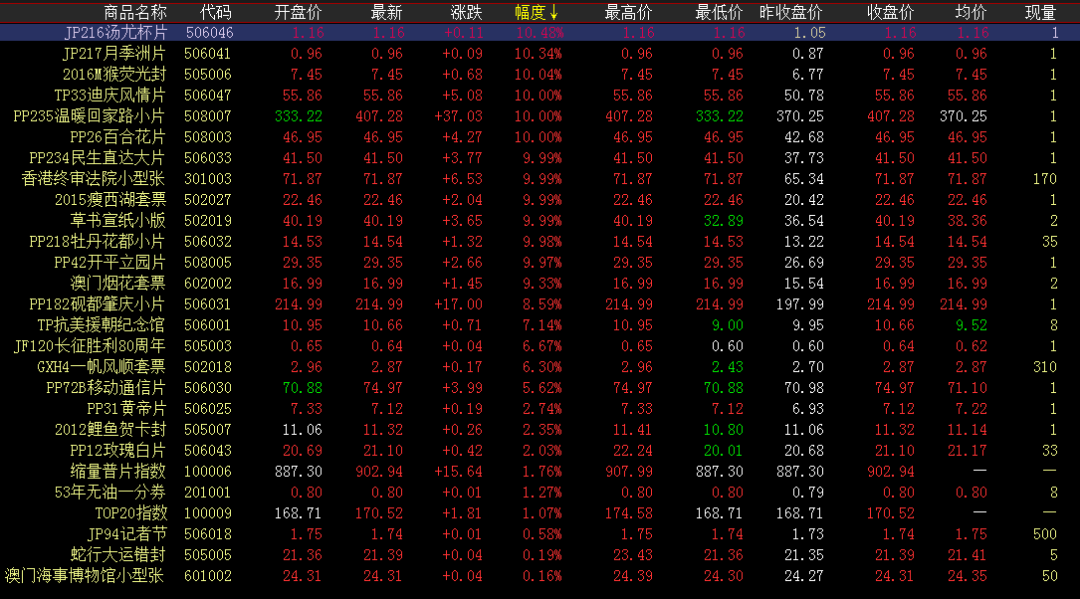 涨幅榜方面,迪庆风情片上行趋势继续,开盘上攻小幅成交涨停收尾。温暖回家路早盘短期下探蓄势,随后上行至高位小幅成交涨停封板。民生直达大片高开高走涨停收尾,延续之前涨势,上行至阶段性高位。终审法院买方继续拉涨,早盘上攻午盘高位成交涨停封板。牡丹花都小片蓄势上行,开盘拉涨小幅成交,午盘继续跟进,涨停报收。开平立园片延续前期涨势,继续发力上行,开盘走高大涨收红。成交活跃度方面,终审法院买盘主导持续跟进,延续上涨走势,成交量保持稳健。红楼梦小型张短期宽幅震荡,买卖两旺午盘持续成交,活跃盘面交投。唐诗、三轮羊、红楼梦小版、澳门海事走势稳健微涨收红,买卖互动交投活跃,午盘持续成交,助力盘面交投。木兰辞小型张、抗战小型张早盘发力大单量成交,午盘持续跟进,成交稳定可观。人生是一场追求,也是一场领悟。有能力就不必气馁,有价值就不必炫耀。生命是一种过程而不是结果,学会享受过程,精彩每一天。