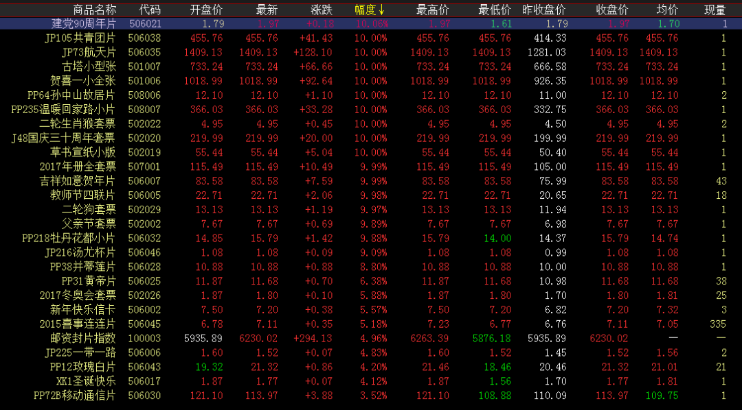 涨幅榜方面,牡丹花都小片买卖双方继续小幅跟进,早盘微涨蓄势,午后上攻至高位大涨收红。建党90周年片连日上涨,买卖双方继续跟进震荡成交,尾盘高位涨停。二轮猴蓄势上行阶段,买方继续加大跟投,早盘上攻高位成交,午后持续增量跟进,涨停收尾。温暖回家路继续蓄势而上阶段性上扬,开盘收红高位一字涨停。国庆三十周年套票高位调整酝酿,短暂下调后重新收红。吉祥如意贺年片延续前期升势,卖方发力拉涨,高开高走一字涨停。成交活跃度方面,终审法院早盘短暂宽幅震荡,买卖双方交投活跃度不减,午盘以微涨价位大当量交投,领跑成交榜。唐诗、蛇行大运、香港猴、三国五、木兰辞套票等红线上方小幅震荡,尾盘微涨收红,买卖两旺午盘持续成交,活跃盘面交投。一生中,所遇的风景很多,不是所有的遇见,都能守望成美丽的风景。路过的,都是风景;擦肩的,都是过客;驻留心中的,才是深情。