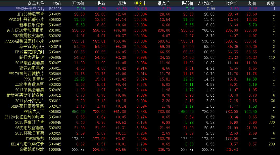 涨幅榜方面,开平立园片触底反弹,买方投入小幅成交,高低互现间高位涨停收尾。菊花邮资封、诗歌节片蓄势上涨,早盘上攻走高一字涨停。牡丹花都小片低位上涨,买方跟进蓄势拉升,涨停位报收。温暖回家路小片持续高位上突,开盘上攻卖盘拉涨,涨停收尾。草书宣纸小版蓄势上涨,卖盘拉升高位涨停。蛇行大运短暂下调后回升,买盘发力投入,涨停封板。成交活跃度方面,红楼梦小型张早盘宽幅震荡午盘微涨,持续放量成交,继续领跑成交榜。荧光猴白片、抗战小型张、木兰辞小型张早盘大单成交,午盘持续跟进,成交量继续放大。唐诗、三轮羊、三国五、夜宴图红线上方小幅震荡微涨收红,午盘持续交投,活跃盘面成交。 有什么样的心态,往往就会有什么样的命运。只要我们直面生活,傲视不幸,笑对痛苦,就一定能攥紧命运的缰绳,活出不一样的人生。