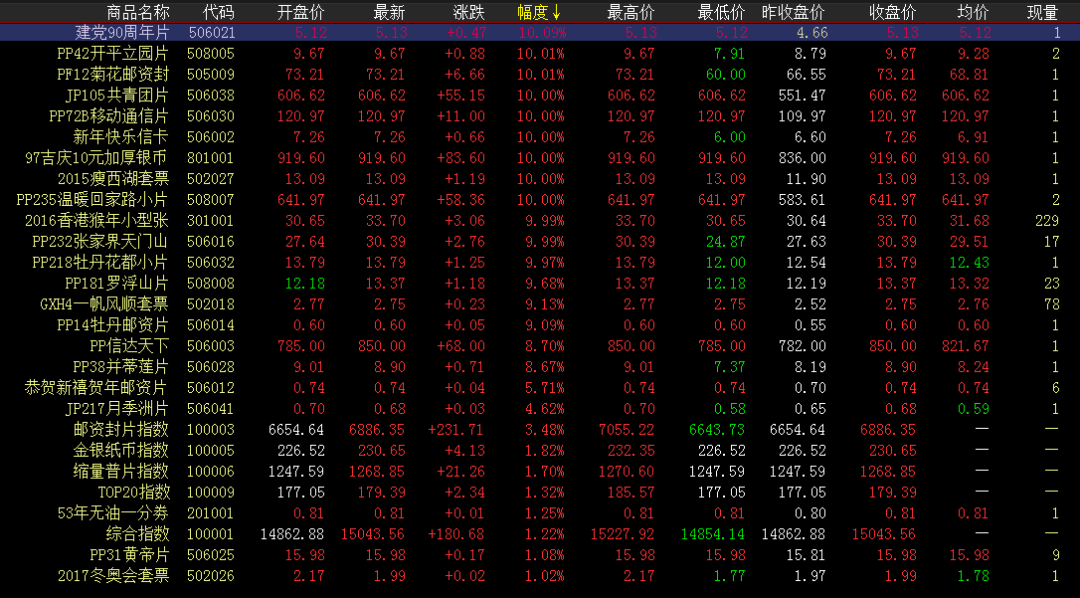 涨幅榜方面,建党90周年片、温暖回家路小片继续高位突破,开盘上行走高,高位涨停报收。共青团片延续前期升势,持续高位上行,早盘高开涨停封板。开平立园片企稳上涨、菊花邮资封蓄势上行,买盘继续跟进,拉涨收红。瘦西湖套票继续企稳上涨,卖盘拉涨早盘走高小幅成交,涨停封板。香港猴蓄势上扬,买盘投入发力拉涨,增量成交涨停报收。成交活跃度方面,终审发院保持微涨收红,早盘开启交投,午盘放量跟进,稳居成交榜前列。荧光猴白片走势稳健,早盘微涨收红大单交投,午盘继续投入,成交量不减。唐诗、香港猴、三轮羊、三轮虎、夜宴图等红线上方窄幅震荡,午盘持续小幅成交,买卖互动交投活跃。 你不能决定生命的长度,但你能够控制它的宽度;你不能左右他人,但你能够把握今日;你不能样样胜利,但你能够事事尽力。