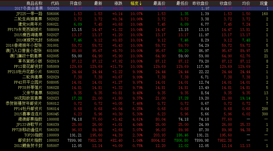 涨幅榜方面,建党90周年片涨势延续,早盘上行走高至涨停价位,继续高位攀升。牡丹花都小片、草书宣纸、菊花邮资封继续上涨,卖盘持续拉升,开盘走高涨停报收。香港猴买方继续投入,高开高走持续成交,涨停封板。澳门人口普查近期阶段性上行,买方投入蓄势拉涨,开盘微涨持续成交,尾盘冲高涨停封板。澳门廉政十载下行探底低位回升,买方继续跟进,早盘上攻小幅成交,高位涨停报收。成交活跃度方面,红楼梦小型张、终审法院小型张持续微涨运行,买卖互动交投活跃,午盘放量成交,领跑成交榜。蛇行大运、三国五、三轮羊、唐诗、澳门海事等小幅红盘震荡前行,午盘继续以微涨价位持续成交。荧光猴白片微涨收红,早盘大单成交,助力盘面交投。 人生没有停靠站,现实永远是一个出发点。无论何时何地,不能放弃,只有保持奋斗的姿态,才能证明生命的存在。