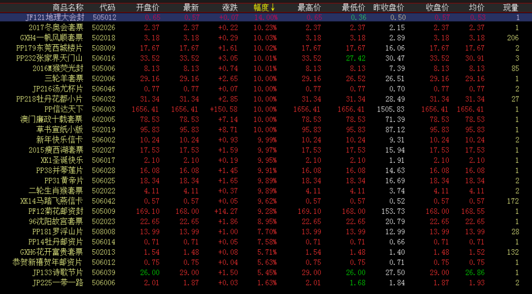涨幅榜方面,东莞西城楼片、猴荧光封卖盘拉涨蓄势上升,早盘高开小幅成交一字涨停。三轮羊蓄势上涨,早盘上攻至涨停位,高位持续成交,价量齐升。信达天下、牡丹花都小片、草书宣纸持续上行,早盘上涨收红,小幅成交涨停报收。 成交活跃度方面,终审法院走持续稳健前行,早盘开启小幅成交,午盘持续跟进,继续领跑成交榜。玫瑰白片买盘发力投入,买卖互动交投活跃,成交量扩大。唐诗、澳门海事、三国五、木兰辞套票、红楼梦小版等保持微涨前行,午盘持续小幅成交,买卖互动活跃盘面交投。每一个优秀的人,都有一段沉默的时光。那一段时光,是付出了很多努力,忍受孤独和寂寞,不抱怨不诉苦,日后说起时,连自己都能被感动日子。