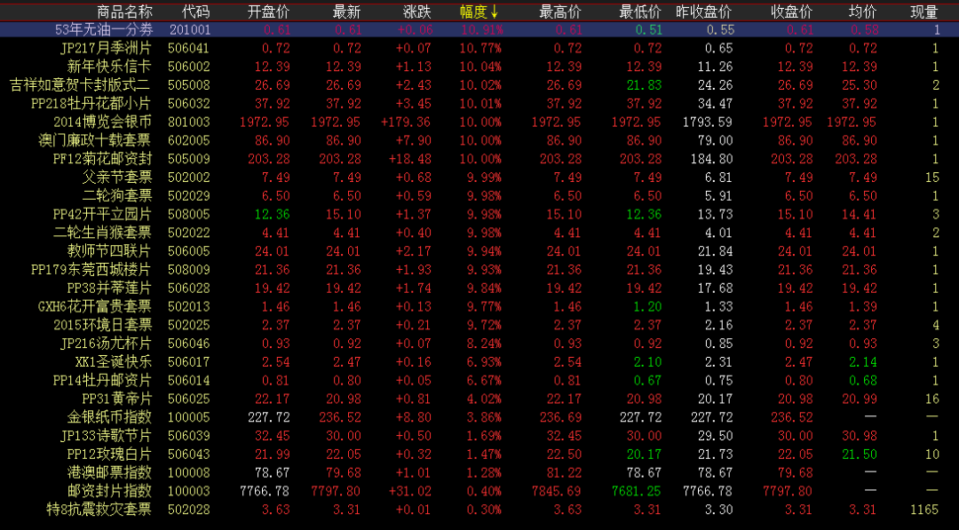 涨幅榜方面,牡丹花都小片、菊花邮资封、东莞西城楼片、博览会银币继续高位攀升,开盘走高卖盘拉涨上行,小幅成交一字涨停。开平立园片开盘走低,随后上行至涨停位,大涨收红。父亲节套票早盘上攻走红小幅成交,阶段性探底回升。新年快乐信卡高开高走一字涨停,高位震荡上升。成交活跃度方面,红楼梦小型张、终审法院早盘微涨开启成交,持续跟进,买卖两旺交投活跃。荧光猴白片早盘大单成交,午盘继续跟进,成交量稳定。唐诗、蛇行大运、三国五、夜宴图、木兰辞套票走势稳健红线上方微幅震荡,午盘持续小幅成交,助力盘面交投。为明天做准备的最好方法就是集中你所有智慧,所有的热忱,把今天的工作做得尽善尽美,这就是你能应付未来的唯一方法。