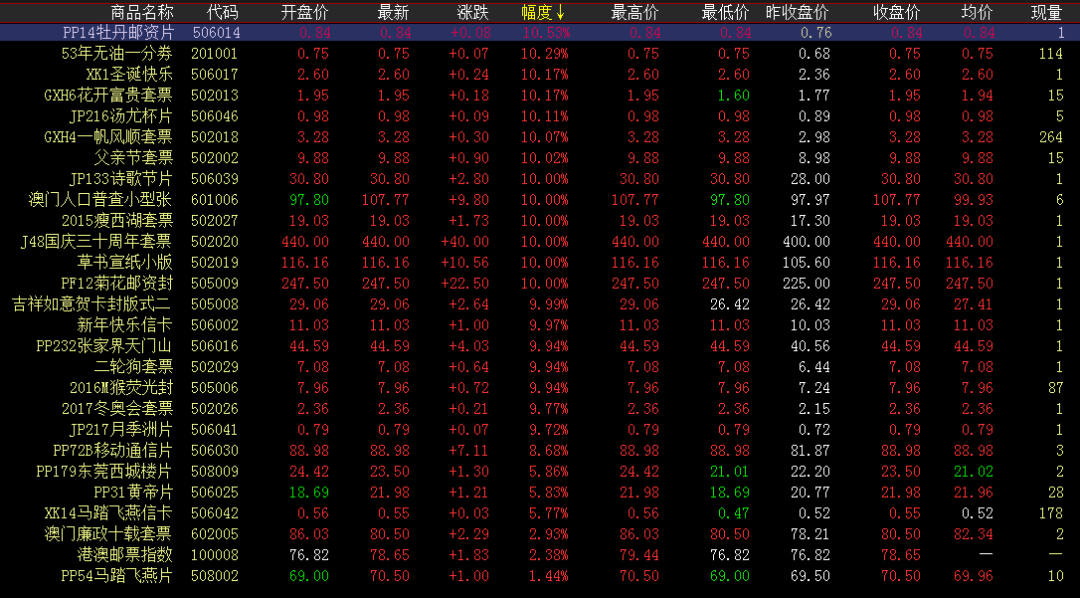 今日环球综合指数上涨51.37点,涨幅0.30%,收报17002.96点。分类指数方面,港澳邮票、邮票型张、电话磁卡微涨,邮资封片、TOP20、金银纸币、缩量普片下跌。