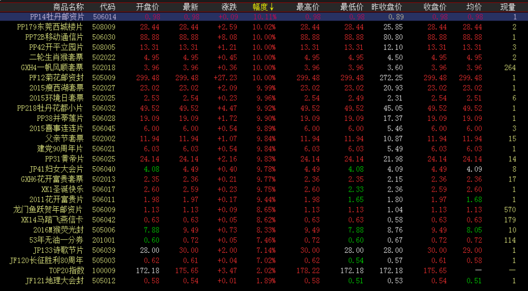 涨幅榜方面,牡丹邮资片、东莞西城楼片、移动通信片、开平立园片、二轮猴套票、菊花邮资封延续上涨走势,开盘上攻小幅度成交,高位大涨收红,继续高位攀升。成交活跃度方面,红楼梦小型张、终审法院早盘微涨交投活跃,午盘继续跟进,继续领跑成交榜。香港猴微涨收红,早盘开启持续交投,午盘继续跟进,成交量扩大。唐诗、蛇行大运、三轮羊、三国五、澳门海事走势稳健微涨收红,午盘持续小幅成交,助力盘面交投。梦是一条道路,终点是深不可测的潜意识。梦也是一面镜子,一直映照着人生最初的自己。