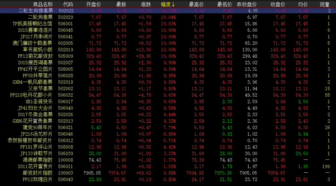 涨幅榜方面,开平立园片、二轮猴套票、菊花邮资封、抗美纪念馆、澳门廉政、草书延续上涨走势,开盘上攻小幅度成交,高位大涨收红,继续高位攀升。成交活跃度方面,香港终审、唐诗、红楼梦小型张、蛇行大运早盘微涨交投活跃,午盘继续跟进,继续领跑成交榜。香港猴微涨收红,早盘开启持续交投,午盘继续跟进,成交量扩大。唐诗、三轮羊、三国五、澳门海事走势稳健微涨收红,午盘持续小幅成交,助力盘面交投。梦是一条道路,终点是深不可测的潜意识。梦也是一面镜子,一直映照着人生最初的自己。