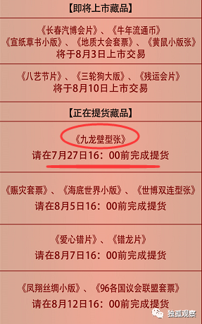 重要提示:下周一(7月27日)是中南文交所九龙壁小型张最后提货转板日期,下午四点截止。因为本周六、日不能提货,因此,下周一(7月27日)上述藏品持仓投资人抓紧转板,截止到下午四点。还没有开户的投资人抓紧选择2576号段开户,特此通知。