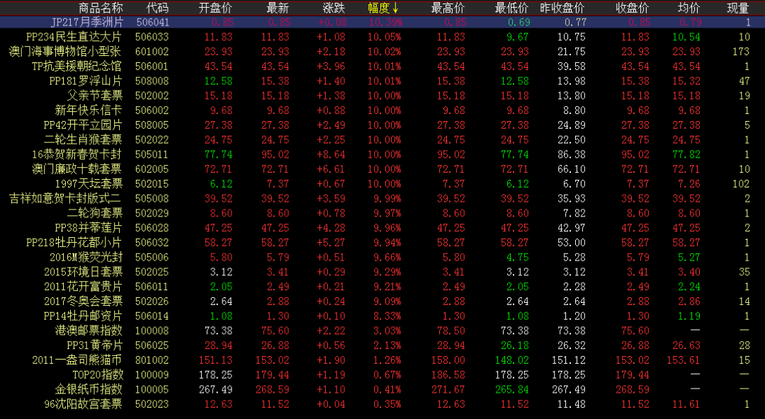 涨幅榜方面,月季洲片、民生直达、澳门海事、二轮猴套票、抗美片、罗浮山片,父亲节套票、开平立园片开盘上攻小幅成交,继续高位攀升大涨收红。其中澳门海事、澳门廉政全天涨停封盘,成交活跃度方面红楼梦小型张、终审法院小型张、唐诗、三轮羊、蛇行大运、香港猴早盘微涨交投活跃,午盘持续跟进,领跑成交榜。三国五、木兰辞、红小版、三轮虎、走势稳健微涨成交横盘收尾,买卖互动卖盘微涨大单交投,成交量扩大。猴年大吉、荧光猴白片、香港抗战走势稳健微涨收红,午盘持续小幅成交,助力盘面交投。任何收获都不是巧合,而是用日复一日的付出换来。不怕你每天迈的步子太小,只怕你停滞不前;不怕你每天做的事太少,只怕你无所事事。