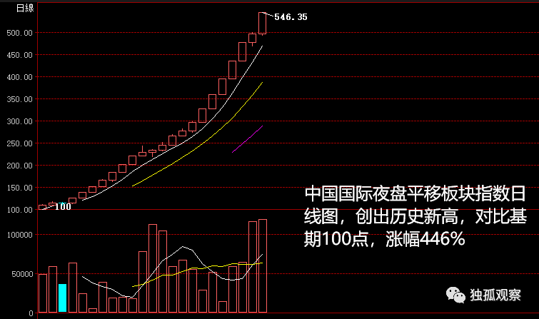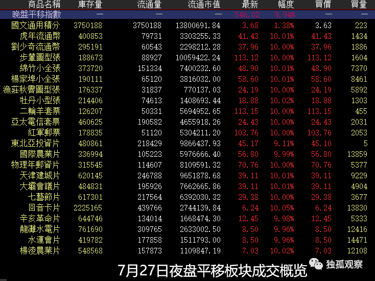 截止到7月27日夜盘收盘,整个平移板块的表现是这个样子滴,夜盘平移板块指数再创新高: