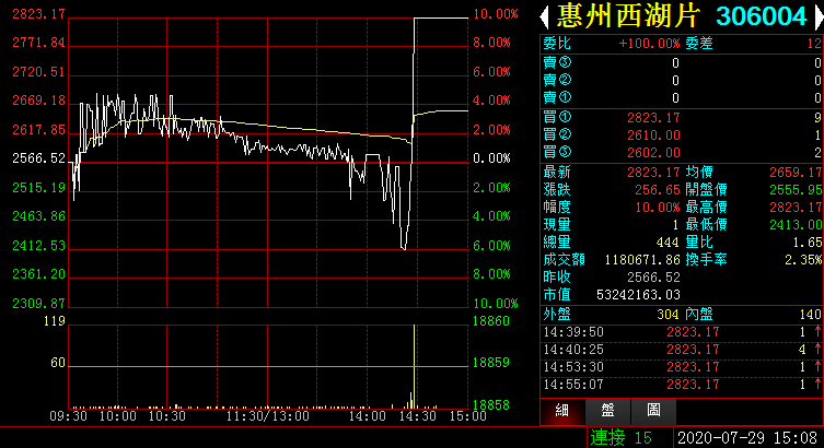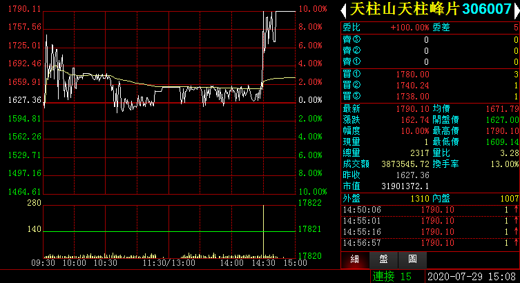 今日在《东北亚会徽片》力挽狂澜之前,缩普大军的《惠州西湖》 《天柱山》两元大将为行情走势的反转奠定了基调,两个品种都在2:30开始发力上攻,最终维持以涨停收官。