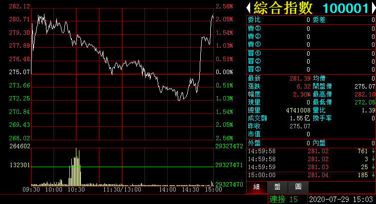 行情综述:今日早盘综合指数高开后震荡回落,一路下探至273点附近后开始反弹。14:30左右随着缩普战神《东北亚会徽片》的强势涨停,大盘彻底扭转态势发力上涨。最终综合指数涨幅2.30%,报收281.39点!总成交金额1.55亿CNH。