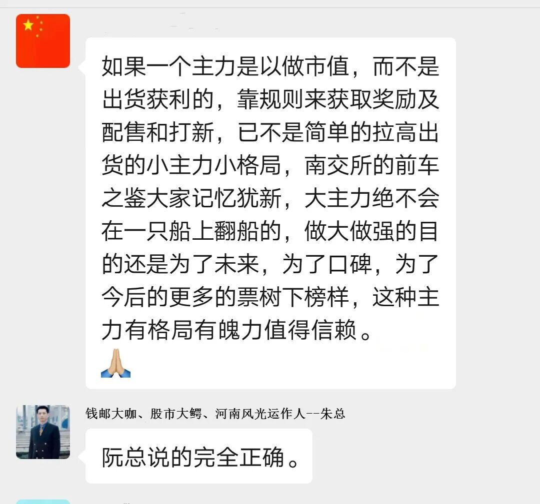 作为钱邮市场大咖、股市资本大鳄的朱总今日在微信群畅所欲言,激情满怀,充分展显出对钱邮投资的情怀、对于品种运作的胸怀。