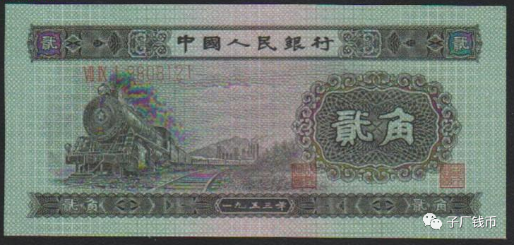 1953年2角人民币正式发行上市的时间为1955年3月,从1971年11月开始只收不付。这张尺寸为120*55mm的纸币采用胶印四色、凹印一色的印刷工艺,正面图案为火车头,背面图案则是花符、国徽及汉、蒙、维、藏文字等。