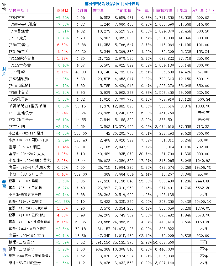 热门品种板块,小幅下跌,延续弱势,邮票表现稍好。63个品种,涨跌平比为15/45/3,涨幅最大的为套票漓江收涨18.46%,跌幅最大的为套票正负电子收跌-17.53%。封片方面,小盘品种梅兰芳、珠峰小幅收涨,表现抗跌,空军、贵州、中央电视台等跌幅居前表现较差。邮票方面,套票漓江、社保全覆盖、五四运动、人大、天津大学等有一定买盘支撑,收涨抗跌,套票正负电子、地质大会跌幅居前,表现较差。钱币方面,二版壹分、贰分,均延续回调,小幅收跌。