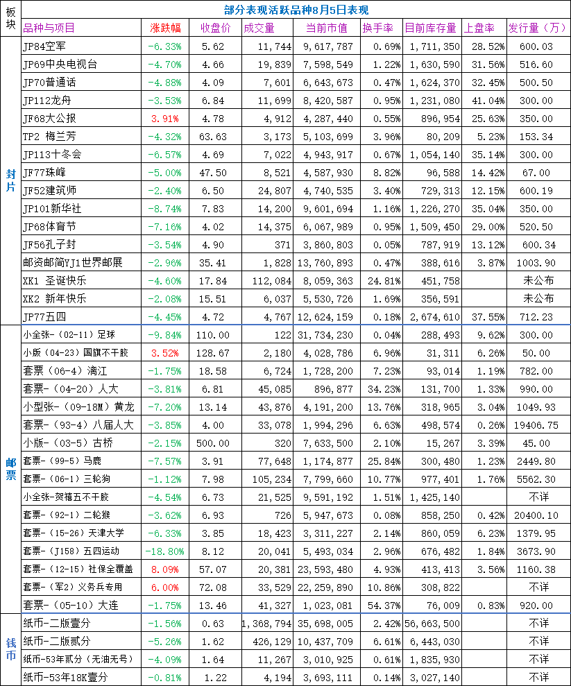 热门品种板块,中阴下跌,63个品种,涨跌平比为8/55/0,涨幅最大的为套票社保全覆盖收涨8.09%,跌幅最大的为套票五四运动收跌-18.8%。封片方面,除3个缩量封勉强收涨外,其他全部下跌,巫山小三峡A、卫生组织跌幅居前,空军、龙舟、海军等低价大盘品种继续下跌。邮票方面,社保全覆盖、义务兵专用,积极买盘支撑,表现强势,地质大会、国旗不干胶小版、鸡小版勉强收涨,其他全部下跌,五四运动、延安、议会联盟跌幅居前。钱币方面,二版壹分,二版贰分,卖盘较重,均下跌。