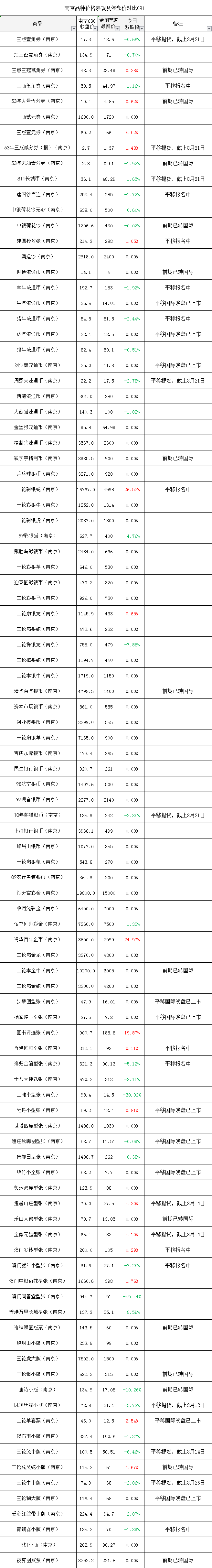 南京品种价格表现及停盘价对比0811