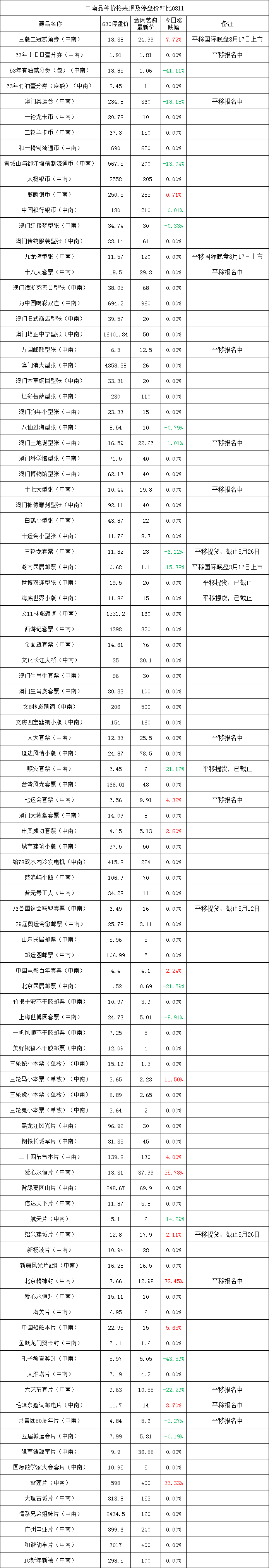中南品种价格表现及停盘价对比0811