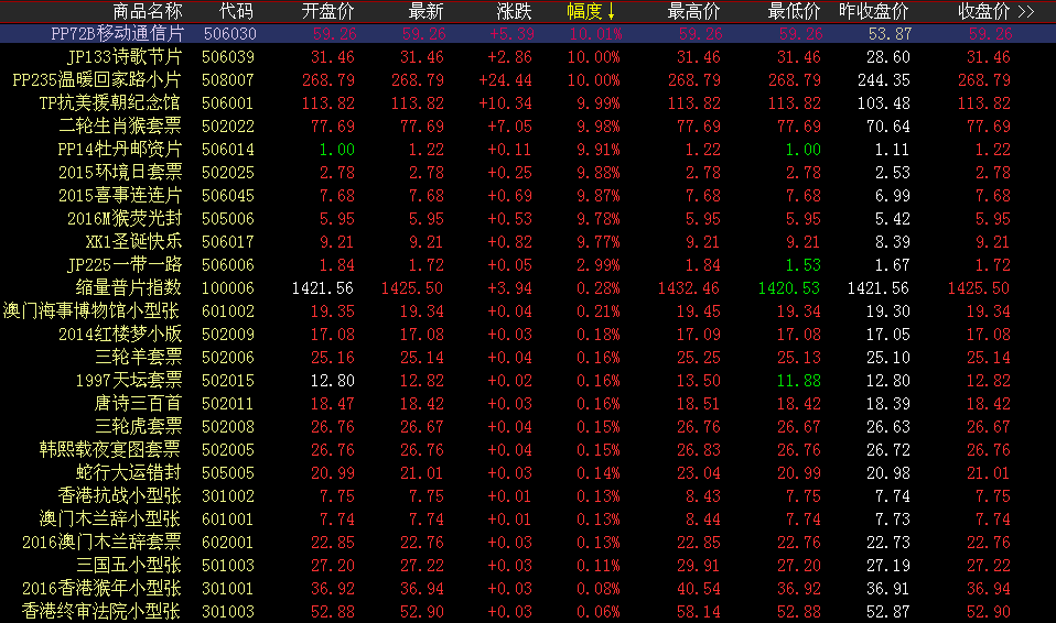环球文化——回调蓄势(无敌剑客)2020.08.12 日期:2020-08-12 今日环球综合指数下跌124.96点,跌幅0.75%,收报16510.41点。分类指数方面,缩量普片微涨,电话磁卡、金银纸币、港澳邮票、邮票型张、邮资封片、TOP20下调。涨幅榜方面,移动、诗歌节、温暖、抗美、牡丹邮资片、环境日、二轮猴、喜事开盘上攻小幅成交。成交活跃度方面红楼梦型张、终审法院、唐诗、蛇行大运、三轮羊、海事、抗战早盘微涨交投活跃,午盘持续跟进,领跑成交榜。三国五、三轮虎、夜宴图、香港猴、木兰辞套票、红小版走势稳健微涨成交横盘收尾,买卖互动卖盘微涨大单交投,成交量扩大。心是人生的镜子。心灰,看到的人与事就是灰色的;心暗,大千世界也无光隐涩。当人心明亮,世界也会是光鲜亮丽。投资有风险,入市需谨慎!