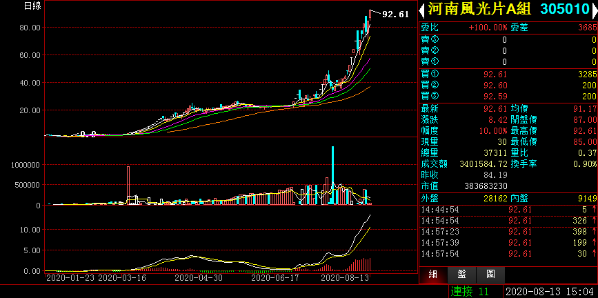 《河南风光片》今日涨停收盘,报收92.61元。该品种自价格最低点0.9元启动以来一路续写传奇,如今价格已经突破百倍!