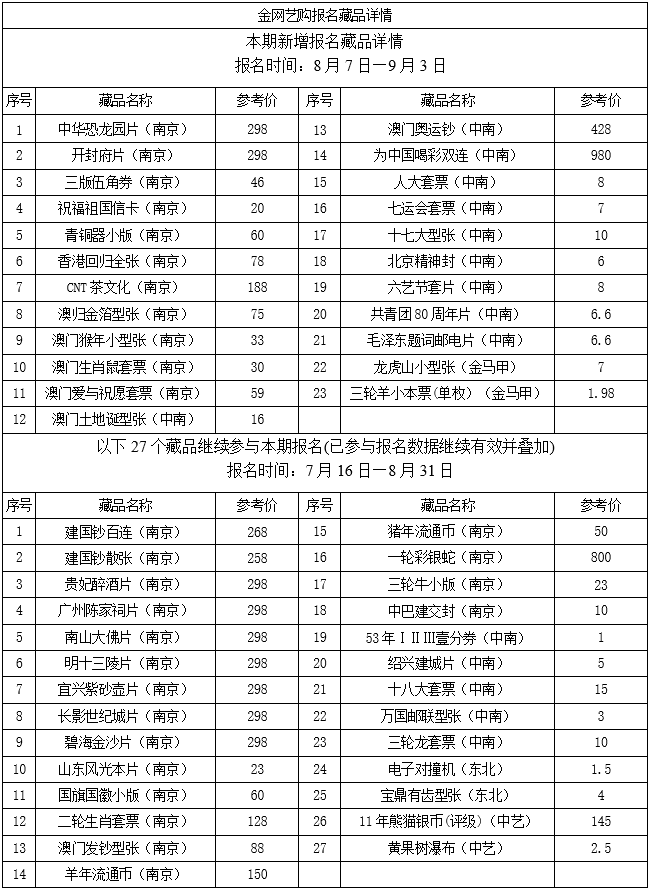 现在多达5家平台的藏品有机会平移至国际文交所重新挂牌上市,南京、中南、东北、中艺、金马甲均有藏品可以报名转入。具体可参与报名品种明细如下: