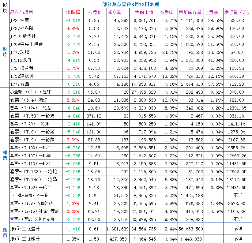 热门品种板块,继续小幅下跌,邮票表现较差,69个品种,涨跌平比为19/48/2,涨幅最大的为TP2梅兰芳收涨6.75%,跌幅最大的为套票正负电子收跌-12.15%。封片方面,梅兰芳、社科院、珠峰等有一定买盘支撑,涨幅居前,表现稍好。其他多数下跌,其中卫生检疫、龙舟、空军跌幅近5%,表现较差。邮票方面,整体表现较差。漓江近期逆势上行持续强势表现不凡,买盘积极,今天领涨,马鹿、五四运动、社保全覆盖等收涨,相对抗跌,正负电子、杭州湾、一轮马跌幅居前,表现较差。钱币方面,二版壹分,卖盘重小幅收跌,收于0.61元,二版贰分,买盘积极,小幅收涨,表现强势。