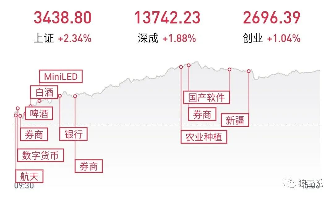 截至收盘,沪指涨2.34%,报收3438点;深成指涨1.88%,报收13742点;创业板指涨1.04%,报收2696点。