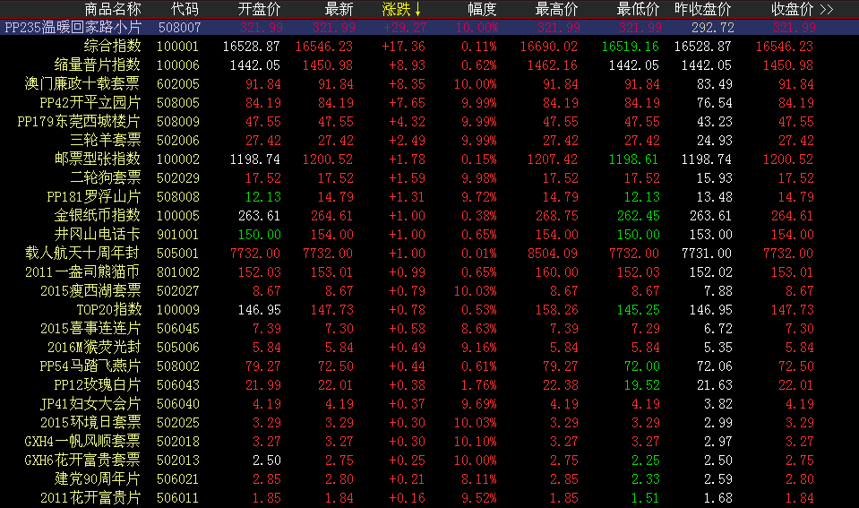 球文化——小幅回升(无敌剑客)2020.08.17 日期:2020-08-17 今日环球综合指数上涨17.36点,涨幅0.11%,收报16546.23点。分类指数方面,电话磁卡、金银纸币、邮票型张、缩量普片、TOP20微涨,邮资封片、港澳邮票下调。涨幅榜方面,三轮羊、猴年大吉、一帆风顺、瘦西湖、环境日、温暖、澳门廉政、花开富贵、开平开盘上攻小幅成交。其中三轮羊、猴年大吉涨停封盘,成交活跃度方面红楼梦型张、终审法院、唐诗、蛇行大运、三国五、海事、三轮虎早盘微涨交投活跃,午盘持续跟进,领跑成交榜。香港猴、夜宴、木兰辞套票、红小版走势稳健微涨成交横盘收尾,买卖互动卖盘微涨大单交投,成交量扩大。只要下定决心,过去的失败,正好是未来行动的借鉴;只要不屈不挠,一时的障碍,正好是推动成功的力量。投资有风险,入市需谨慎!