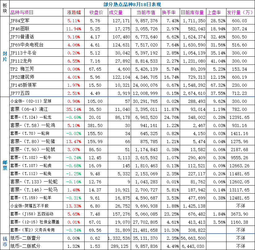 热门品种板块,延续反弹,表现较好,69个品种,涨跌平比为44/20/5,涨幅最大的为套票漓江收涨35.14%,跌幅最大的为JF27EMS收跌-33.23%。封片方面,反弹积极表现趋强。图联、普通话、巫山小三峡A、龙舟等买盘积极,表现强势,多数低价大盘邮资片获积极买盘。小盘品种JF27EMS、卫生组织等个别品种跌幅居前表现较差。邮票方面,部分品种反弹积极。套票漓江,近期持续强势,今天大涨35.14%,短短一周多时间价格已翻倍,贺禧五不干胶、天津大学、五四运动、一轮套票马等,涨幅居前表现稍好,套票二轮猴、人大等跌幅居前。钱币方面,二版壹分,横盘震荡,收平,多空均不示弱,贰分,小幅收涨,有一定买盘支撑。