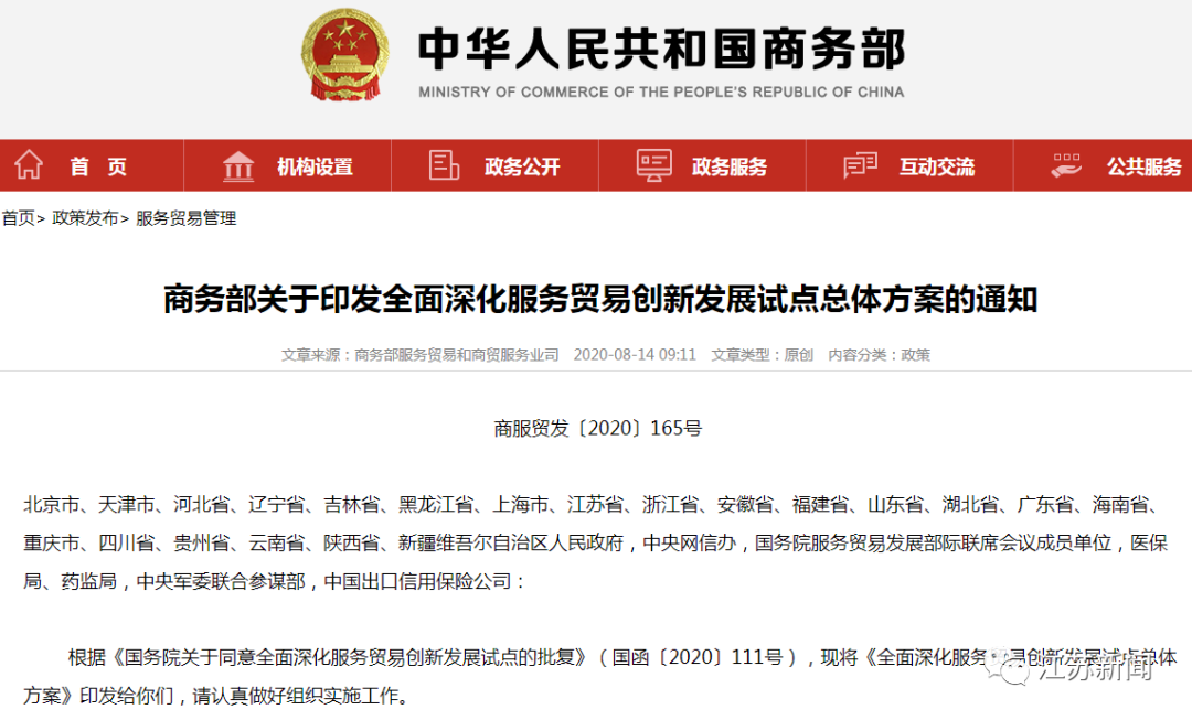 8月14日,商务部网站发布《商务部关于印发全面深化服务贸易创新发展试点总体方案的通知》。