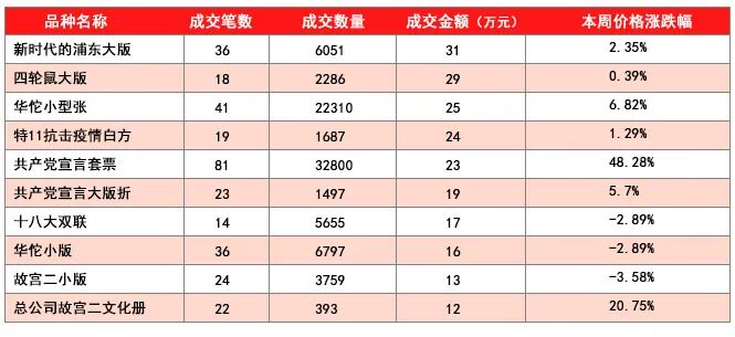 邮币卡互动平台本周热门品种综述 日期:2020-08-30 从网站的数据可以看到,从8月24日到8月30日,板块方面盘面显示“新时代的浦东大版“ 成交额居本周首位,成为本周明星,成交数量6076版,成交额31万元(不包含用户撤贴后自行成交的金额),资金流入20万元,流出11万元,净流入9万元。本周热门品种前十名成交金额排行如下图: 在关注度方面,“共产党宣言套票”是本周用户点击查看最多的品种,关注度为本周之首。小编为大家整理了这几个热门品种的相关价格,如下图:仅供大家参考 以上2张表格统计图中,可以看出共产党宣言套票涨幅近乎翻倍,短短一周成交数量32800套,不愧是关注度最高的邮票品种。 其它统计在内的品种中,千里江山图版票不知不觉中已经从8.5元涨到12元,并带动了古典名画大版出现上涨,挥扇仕女图大版从31.5元涨到37元,高逸图大版从22元涨到25元成交,浴马图大版56元成交,整包59元成交。 另一个热点品种十八大双联31元成交,新时代的浦东大版52.2元成交,华佗小版24元,华佗小型张10.5元,故宫二小版35元成交,故宫二小型张14.5元成交,玫瑰小版24元,红楼梦四小型张15元,红楼梦四小版23元。 其它未统计在内的品种,19型张小版:军运会小版23.5元成交,鲁班小版17元,粤港澳大湾区小全张8元,五岳图小全张13.5元买盘。丝绸小版:本周丝绸小版卖盘有所增加,一带一路丝绸小版32.5元卖盘,上合峰会丝绸小版32.5元卖盘,中国国际进口博览会丝绸小版33元卖盘,金砖会议丝绸小版23.5元卖盘,G20峰会丝绸小版18.6元成交。 四轮生肖:四轮鼠大版127.5元成交,四轮鼠小版34.5元成交,四轮鼠赠版13.2元,四轮猪大版76元成交,四轮猪小版22元,四轮猪赠版10.8元。双联系列:红楼梦双联24元,高铁双联15.5元,2016亚展双联11.5元成交,抗战双联12.8元成交。 重大题材大版:特11抗击疫情邮票大版(裸版)600元,大版折680元成交,一带一路大版43元买盘。 八月的最后一周行情一直延续稳中有小涨幅的形势,但有一个现象值得关注,那就是曾经帮公司出货的卖货大户,有的已经开始大量买货了,这种现象的出现,说明多空双方的力量正在悄悄的发生着变化,只是这种变化有些人还没有察觉到罢了。故宫紫禁城600周年金银币作为年度热门的金银币近期表现情况:五克单枚银币,本周最低155-160元,最新价格195-205元左右;3X15克方银套装,本周最低1100-1150元,最新价格1350元左右;一 金一银套装,本周最低2000-2050元,最新价格2250元左右;两公单枚斤银币,本周最低28000-28200元,最新价格29000左右;一公斤金币,本周继续稳定在95万左右。纸币板块这周澳门龙钞表现非常抢眼,百连号刀货涨到14200-15000元左右有不少成交,标十散对也有跟涨迹象但成交偏弱。90100,9050 捆货市场找货增加源于小四套捆货配套,捆币刀币价格约有10%-20%的涨幅,其余纸币都是稳中有升。