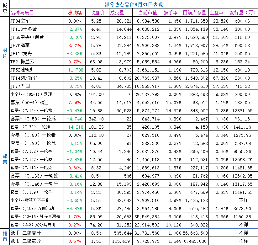 热门品种板块,涨少跌多,表现仍较弱,65个品种,涨跌平比为23/38/4,涨幅最大的为国旗不干胶小版收涨8613.73%(尾盘拉升),跌幅最大的为JF52建筑师收跌-11.78%。封片方面,表现仍较差,多数下跌。圣诞快乐,少量积极买盘支撑,表现较好,其次仅有海军、全国集邮展览等几个品种勉强收涨,买盘稀少。建筑师、大连跌幅居前,收跌5%以上,表现较差。邮票方面,同样多数表现较差,少数品种有较好表现。社保全覆盖延续连涨,国旗不干胶小版、套票人大、漓江、三轮龙小版、凤凰古城等涨幅居前,表现较好,其中漓江、三轮龙小版是近期较为强势的品种。地质大会、第十届中国艺术节、五四运动、贺禧五不干胶等跌幅居前。一轮生肖套票整体仍表现较差,仅一轮兔收涨。钱币方面,二版壹分,卖盘压力大,延续弱势,勉强收平,收于0.56元。二版贰分,获一定买盘支撑,微幅收涨。纪念币建党90周年,微跌,有买盘支撑,表现较稳。