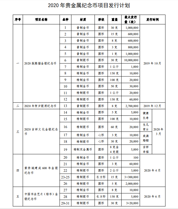 按照央行2020年的贵金属纪念币发行计划,全年会发行10个项目的金银币,一共61个品种。